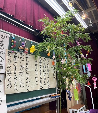 スタッフが手作りした七夕飾りをいっぱい飾り