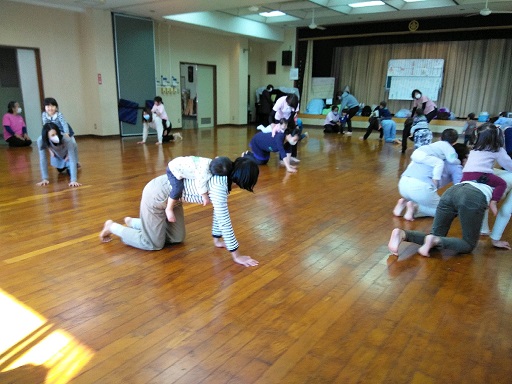 初参加のT君はママから離れて、子どもたちの真似っこです。