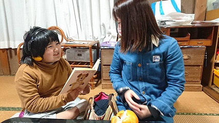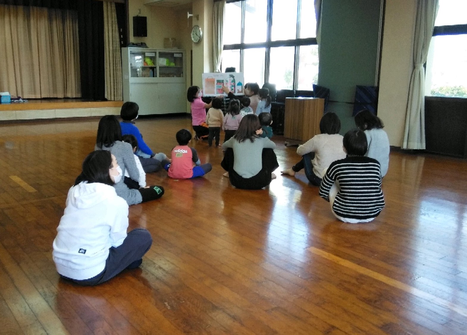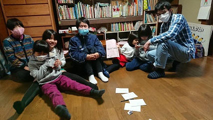 広い板の間の公民館で、7家族の皆さんと遊びました。