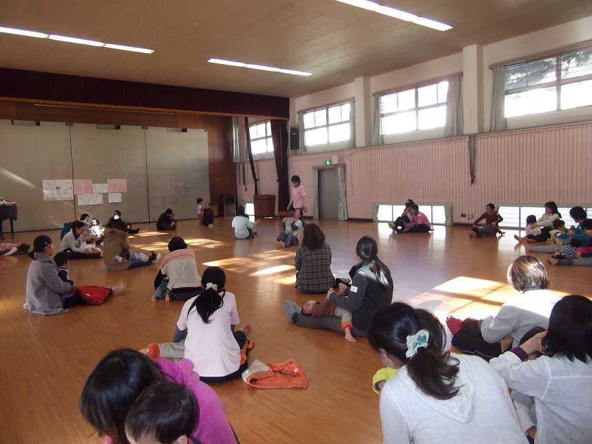 子どもたちは寒さにめげず、広い体育館を走り回ったり、ハイハイしたりと大喜び。