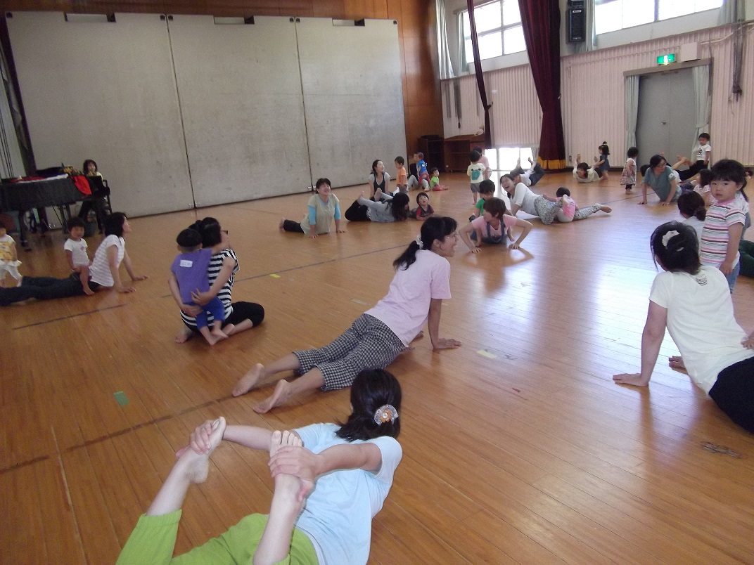 日頃家庭で気軽にできる、ふれあい遊びやリズムでいっぱい身体を動かし、広い板の間の体育館が狭く見えるほどでした。やっぱり板の間はいいな~