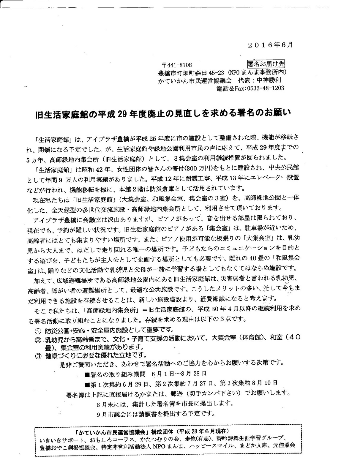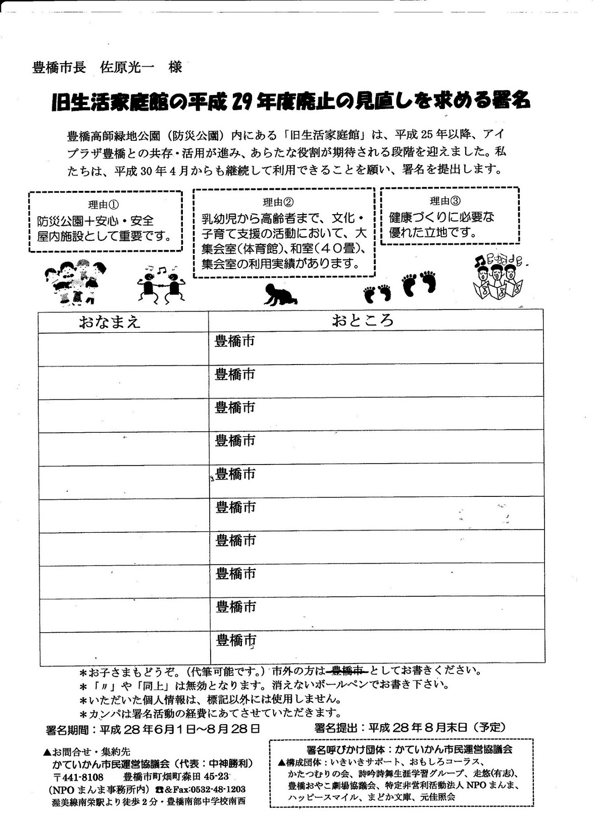 emoji「旧生活家庭館の平成29年度廃止の見直しを求める署名」署名用紙を印刷。