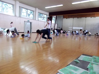 参加。生のピアノで、広い板の間で「さくらんぼリズム」を行っている所を