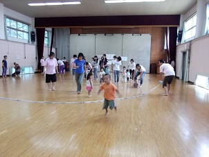 の音にあわせて母と子がはだしになりリズム運動をのびのびと楽しむことができます。