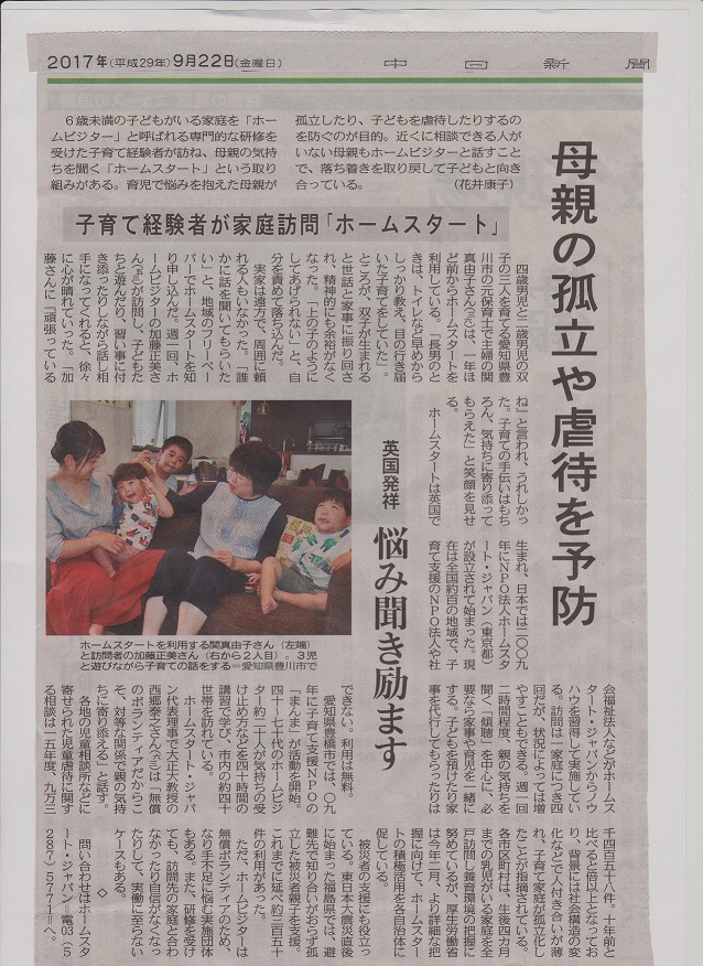 9月22日(金)中日新聞が「ホームスタート」を掲載!