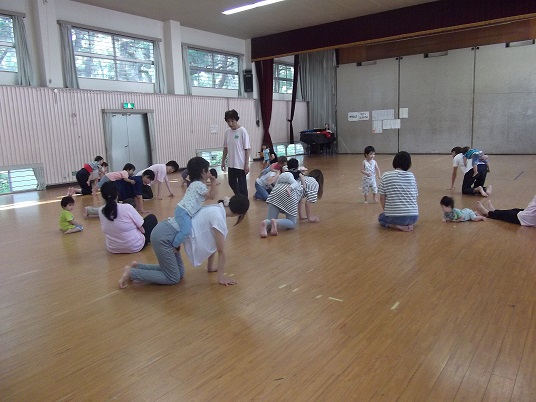 6名のスタッフも一緒に、ひろーい体育館で走り回ったりハイハイしたりと