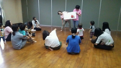 ゆったりとリズムあそびで遊んだ後、初参加Aさんが