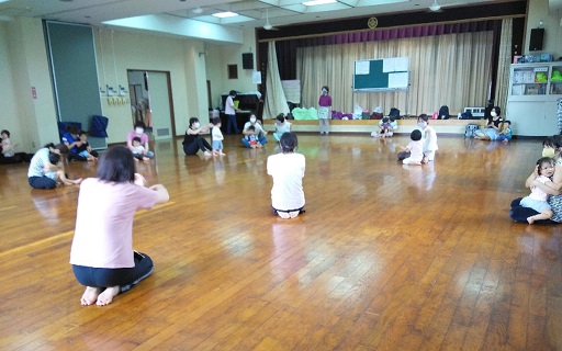 下の子どもさんを、スタッフが抱っこしてリズム。
