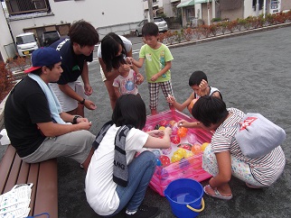 愛知大学地域政策学部「ええじゃない会」のメンバーが第1と第3木曜日に「ありがたや」に遊びに来てくれます。今回、愛大生が「ありがたやなつまつり」を初めて開催しました。企画を考え、みずでっぽう、ストラックアウト、ヨーヨーつり、かたぬき、ボーリングの5つのコーナーを担当。すべてにスタンプが押されると景品がもらえます。子どもたちは、18名のお兄さん、お姉さんとコミニケーションをいっぱいしました。紙芝居、紙飛行機とばし、しっぽ取りと次々と楽しみました。最後にみんなで記念写真です。