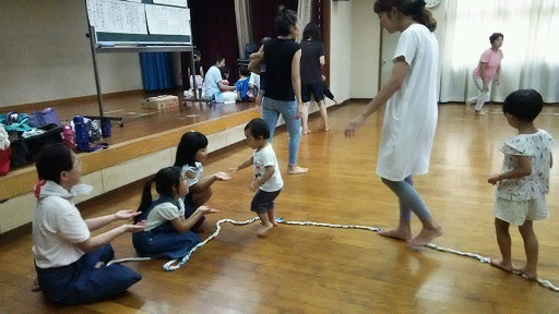 大きな子どもたちの真似をして、いつも参加の子どもたち、お母さんたち。
