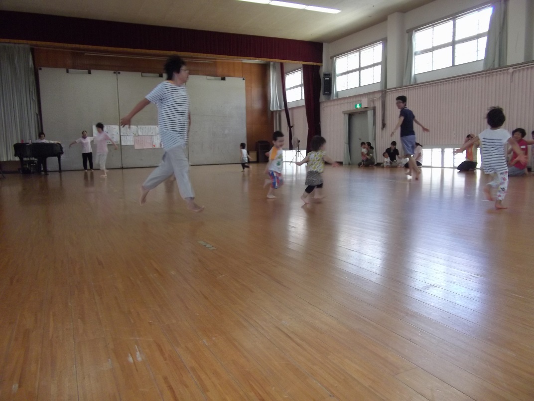 ママさんスタッフのYさんがリズム担当です。幼稚園の年少さんになったKちゃんもとてもしっかりとしてきました。スピードをだして体育館を走り回ります。