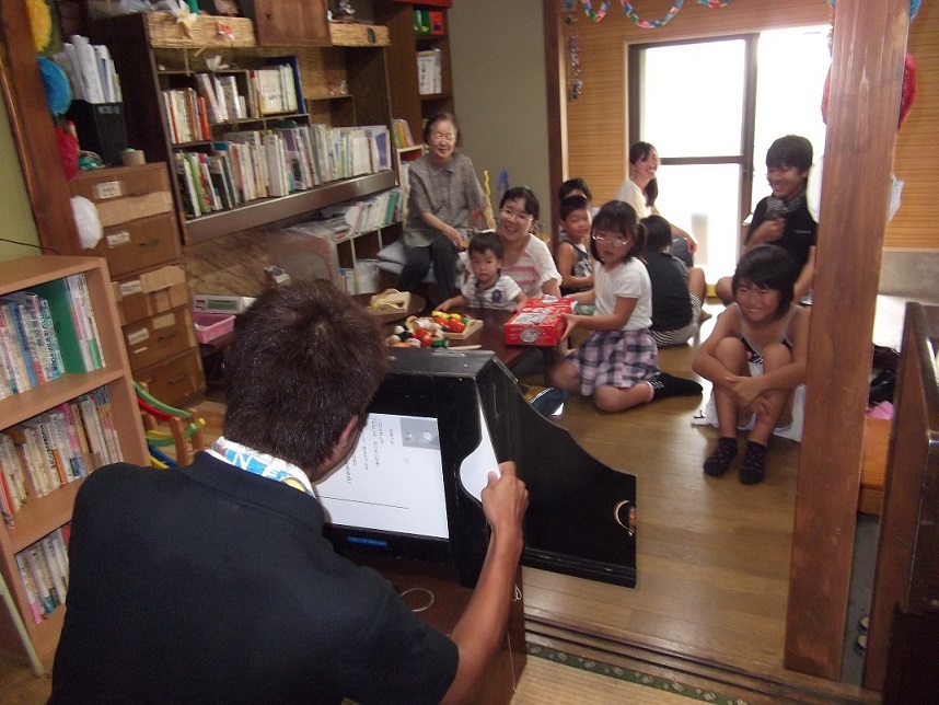 次は、紙芝居の始まりです。お姉さんと一緒に大きな声で読み合ったり満足そう。