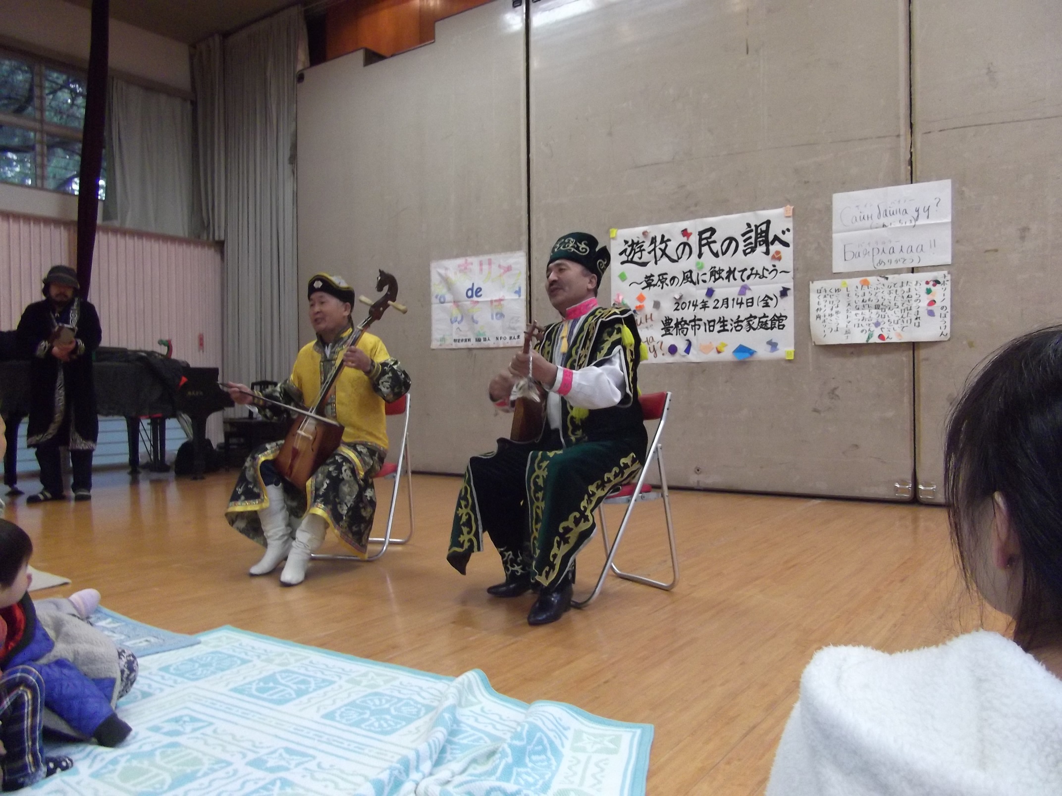 第2部は、コンサートを聴きに来てくれた皆さまと20家族の親子の合計58人は、目の前で馬頭琴とドンブラを演奏する2人の北アジアを代表する2大遊牧民族、モンゴルとカザフからのお客さまをお迎えしました。演奏や歌声は、雄大な草原の国での、馬などの家畜やゆたかな生活を思い描くことができ、ゆったりと豊かな時間を共有できました。