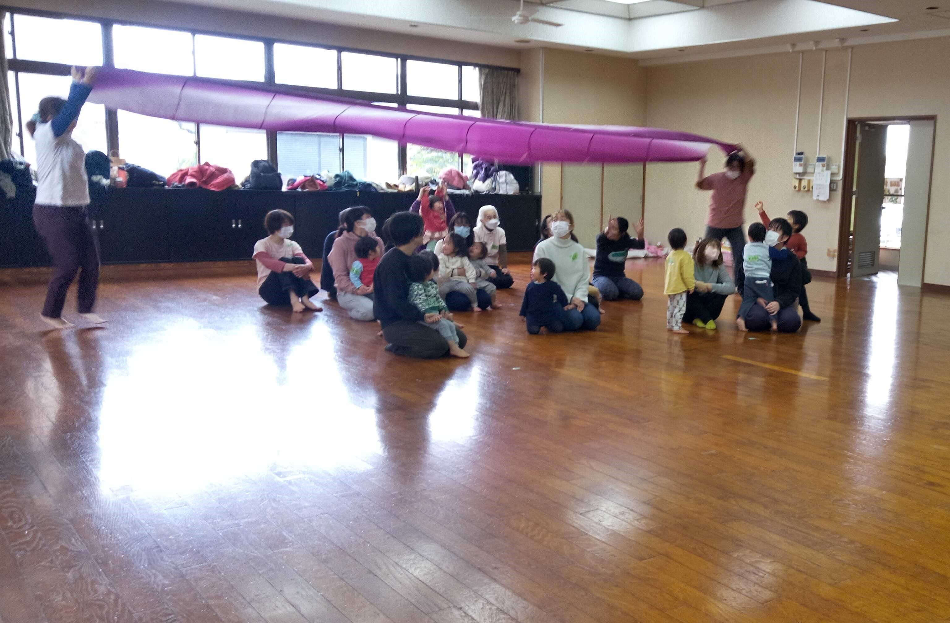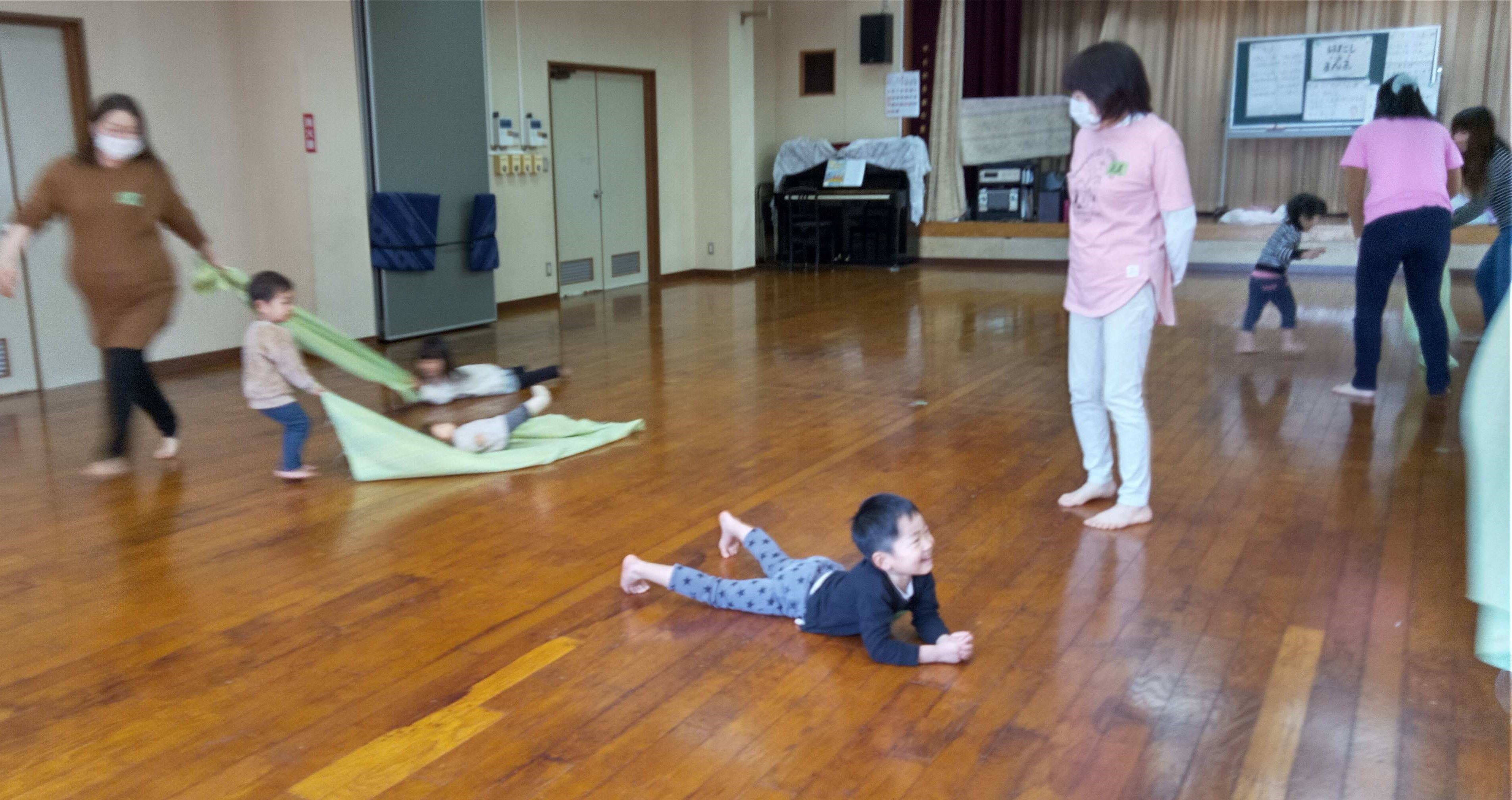 広い板の間でどんどんばし、風呂敷の海