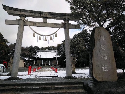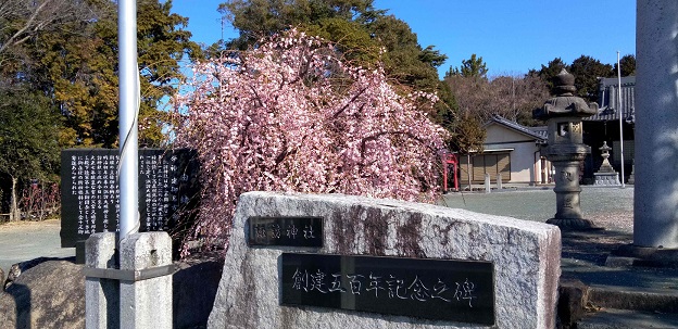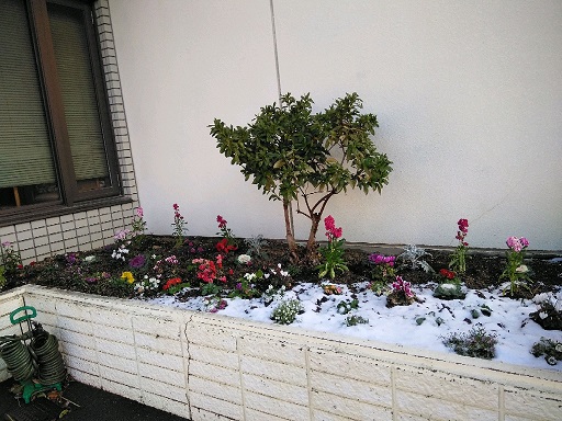 山田諏訪神社も雪化粧。山田公民館のお花は元気!