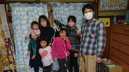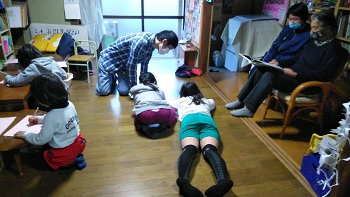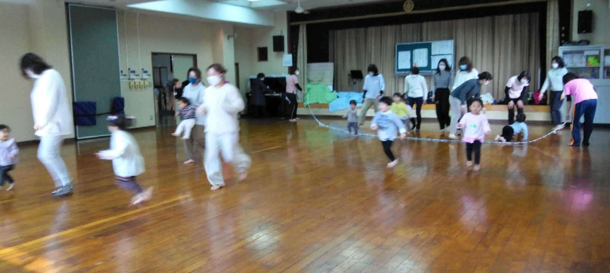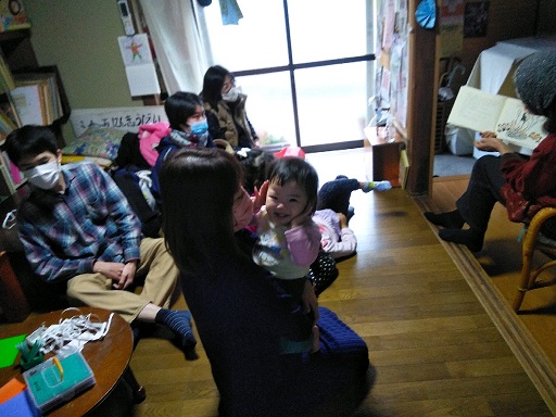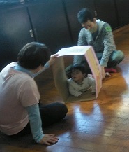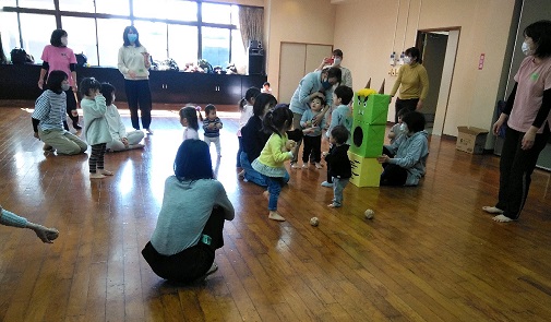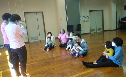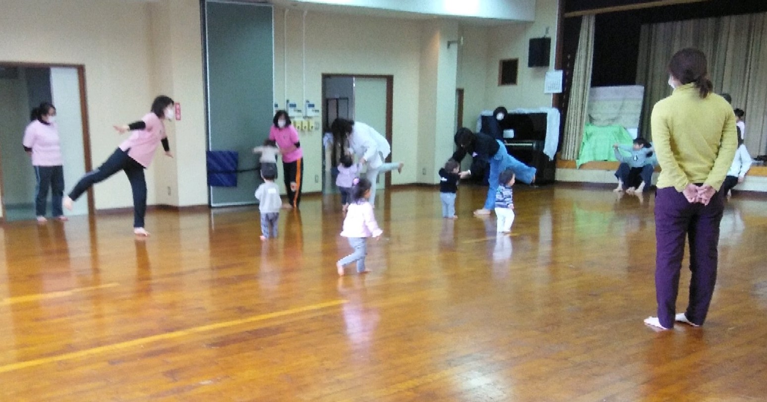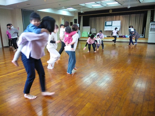 広い板の間の公民館で、7家族の皆さんと遊びました。