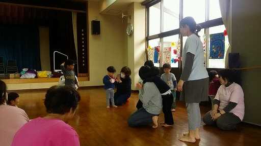 「さくら・さくらんぼリズム」を行います。手遊び・絵本など