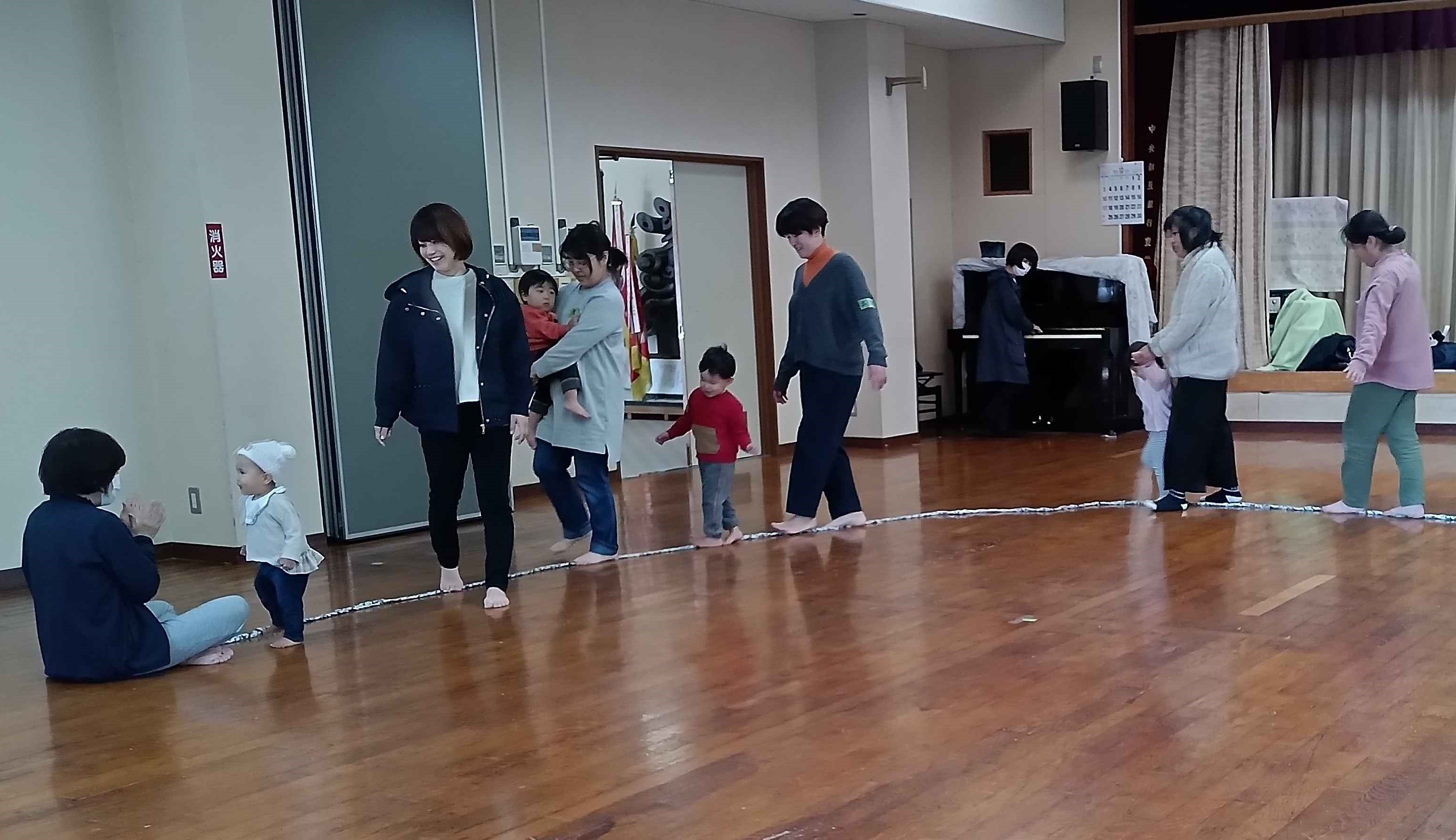 広い板の間でリズムで笑顔