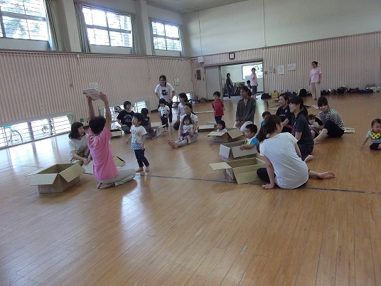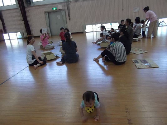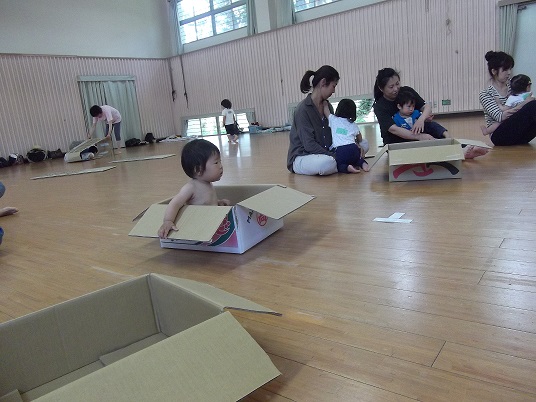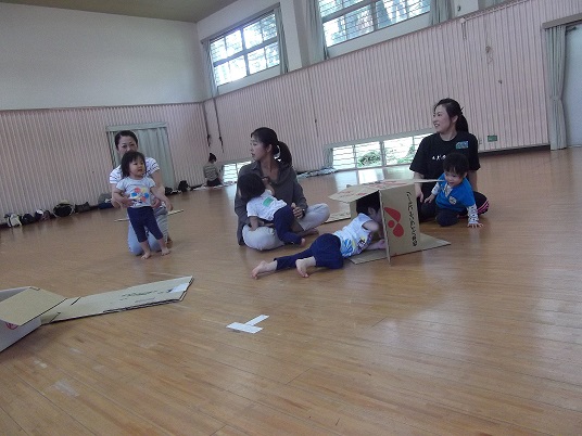 広い板の間で、はう運動あそびや段ボールあそび、新聞紙あそびなど