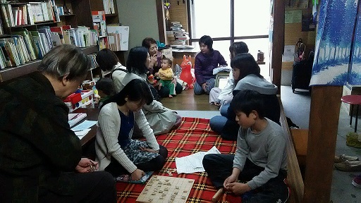畳の上のテーブルで、紙芝居を読んだり、子どもたちとトランプ・