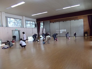子どもたちは、体育館に入るとすぐに裸足になり雑巾がけ。