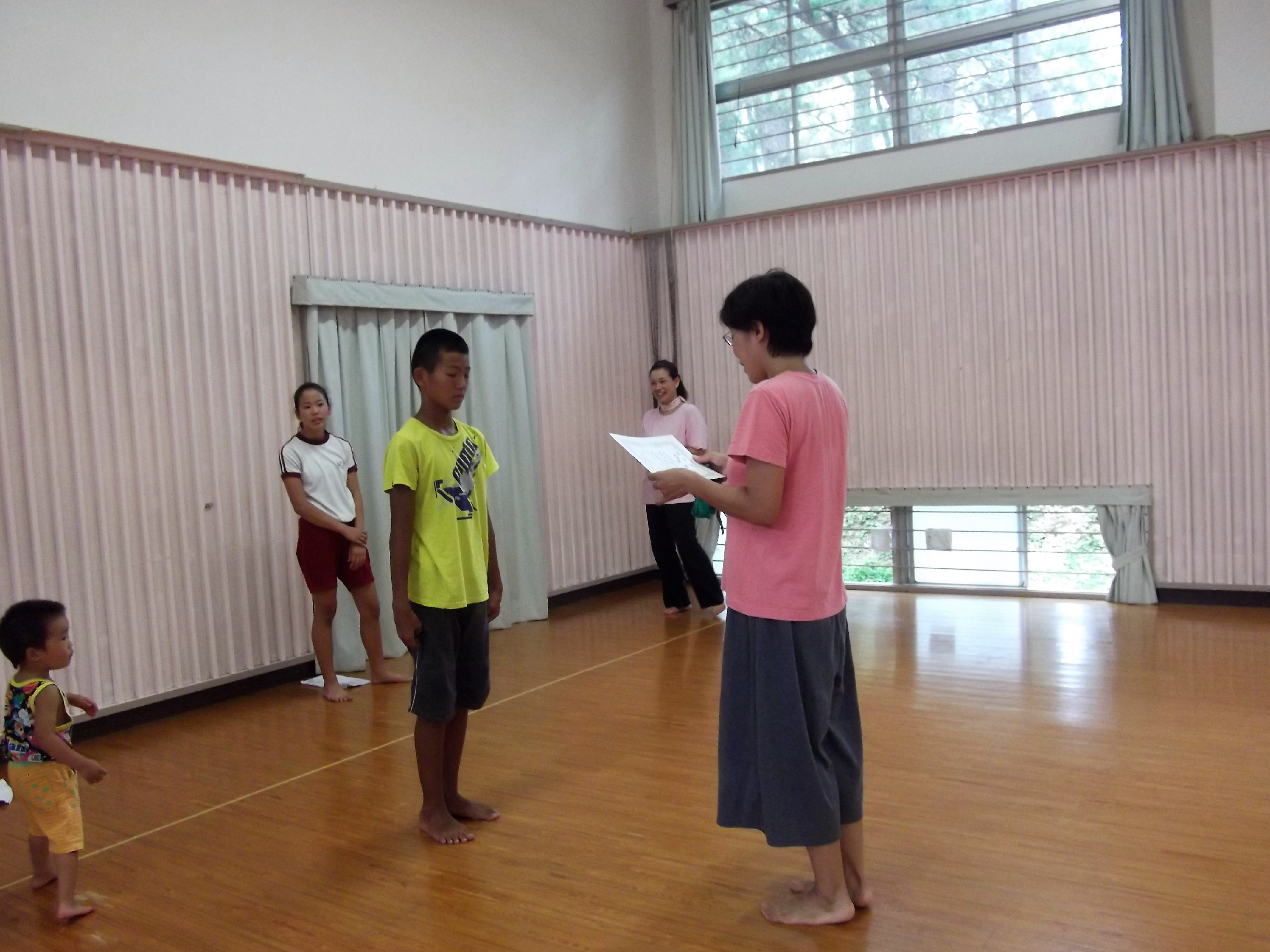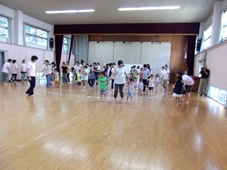 旧生活家庭館の大集会室で、扇風機を回してリズム遊び。