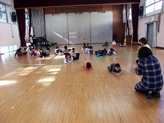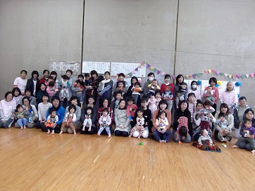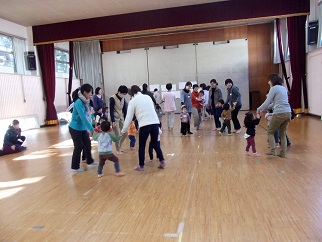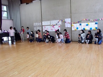子ども18名、大人14名、14家族の皆さんの参加でした。この1年でずいぶんと子どもたちは成長しました。集団あそび「むっくりくまさん、ネコとねずみ」なども楽しんでいます。