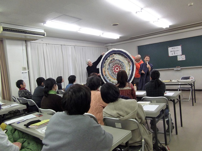 2月25日(木)13時~15時 講師:水野スウさんを迎えて「ほめことばのシャワーde子育て」子育て講座があります。スウさんより一足先に”キルト「ちきゅう」”が到着しました。