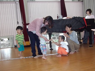 恵の実保育園のリズム講座で教えていただいた「蛙の笛」「まつぼっくり」などの歌や手遊び、ぞうきんがけなどの後は、「どんどんばしわたれ~」とピアノと歌に合わせて、ゆかたをほどいて三つ編みにした布の綱の上を渡ります。今日は、いつも参加のかんた君が渡ってきた子どもたちにタッチをする係りをしてくれました。どうどうと役割をして、子どもたちも大喜び。