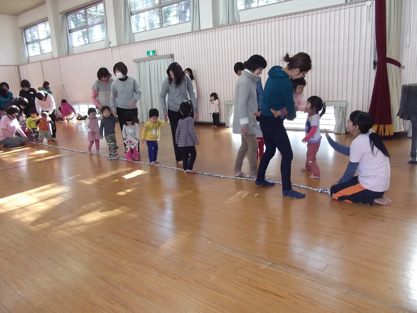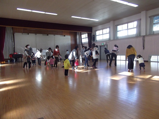 子どもたちは寒さにめげず、広い体育館を走り回ったり、ハイハイしたりと大喜び。