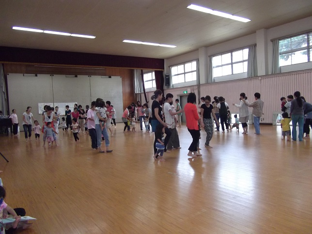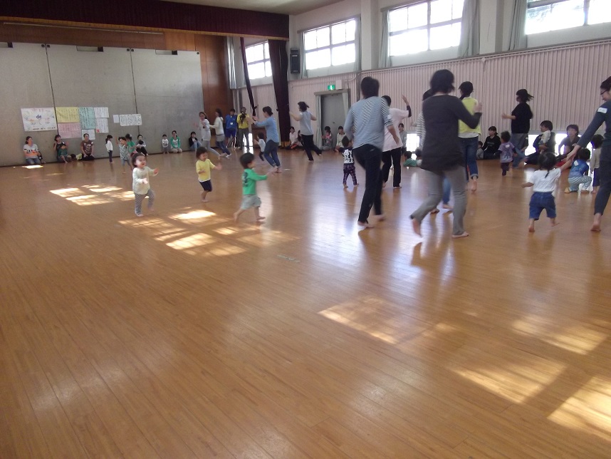 ママさんスタッフのYさんがリズム担当です。幼稚園の年少さんになったKちゃんもとてもしっかりとしてきました。スピードをだして体育館を走り回ります。