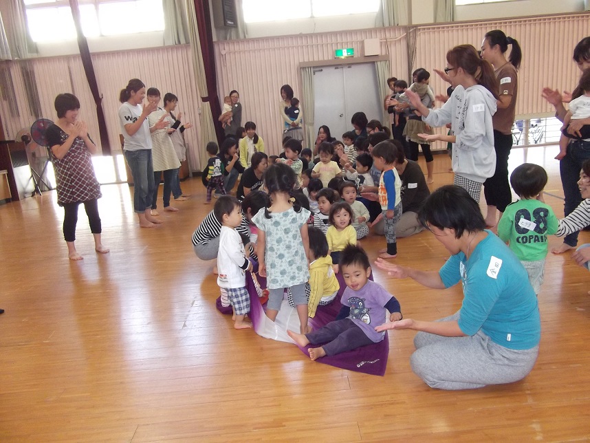 ♪なーべ~なーべ~そーこぬけ~♪みんなでふれあい遊びや紙飛行機づくりをしたりしてゆったりと時間が流れます。ひさしぶりに参加の幼稚園の子たちも大きくなり、手足をのばしてまんまリズムができました。