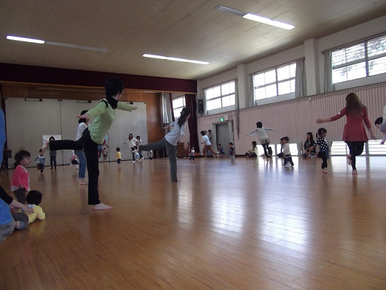 日頃家庭で気軽にできる、ふれあい遊びやリズムでいっぱい身体を動かし、広い板の間の体育館が狭く見えるほどでした。やっぱり板の間はいいな~